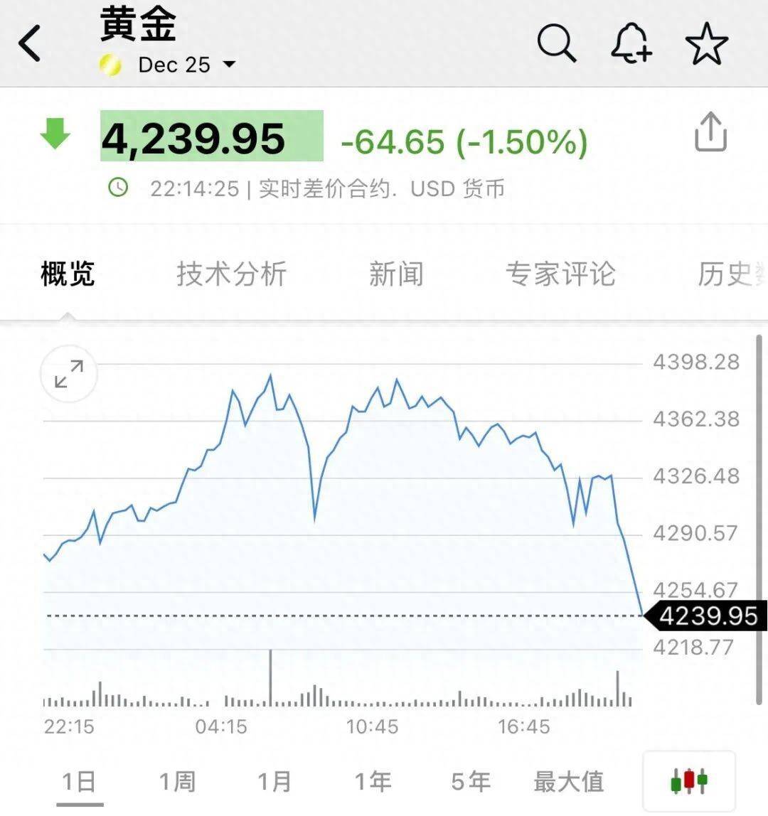 北京时间10月17日晚间,国际金银快速下挫,现货黄金盘中跌超2%,截至发稿仍跌1.5%,报4239.95美元/盎司;现货白银跌5.26%,报50.493美元/盎司。