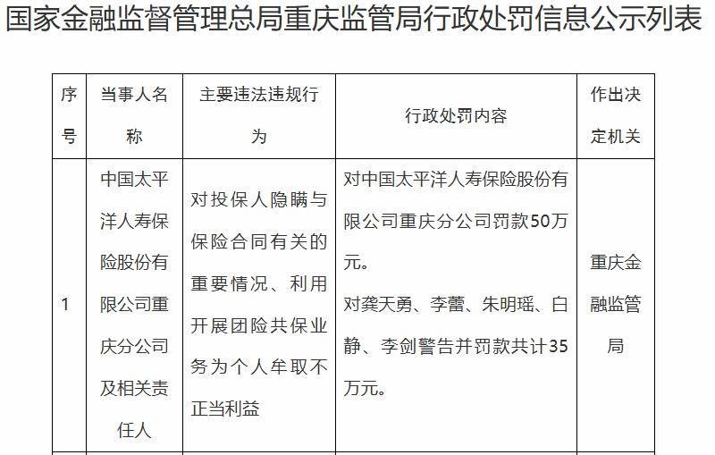 【大河财立方消息】4月10日,国家金融监督管理总局重庆监管局披露的行政处罚信息公示列表显示,因对投保人隐瞒与保险合同有关的重要情况、利用开展团险共保业务为个人牟取不正当利益,中国太平洋人寿保险股份有限公司重庆分公司被罚50万元。
