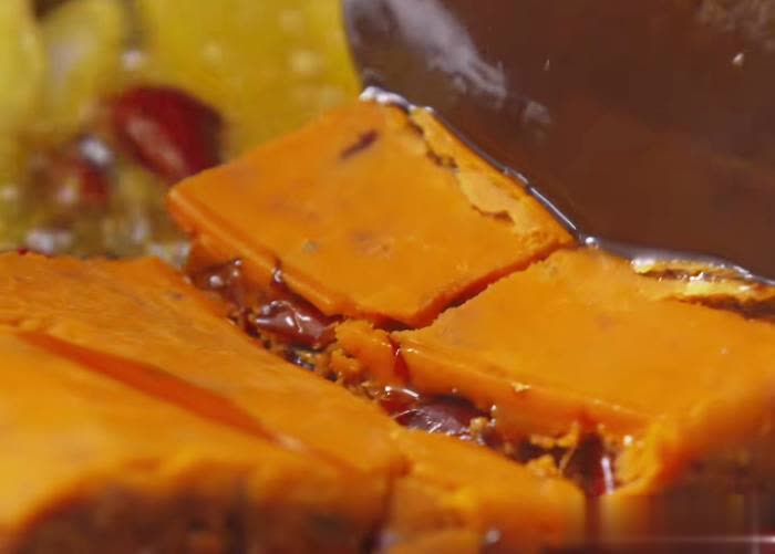 第三步:随后先把切断的干辣椒和花椒放入锅中爆香一分钟;然后再把火锅底料倒入锅中翻炒至完全融化。