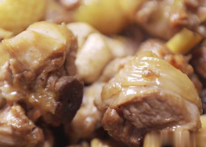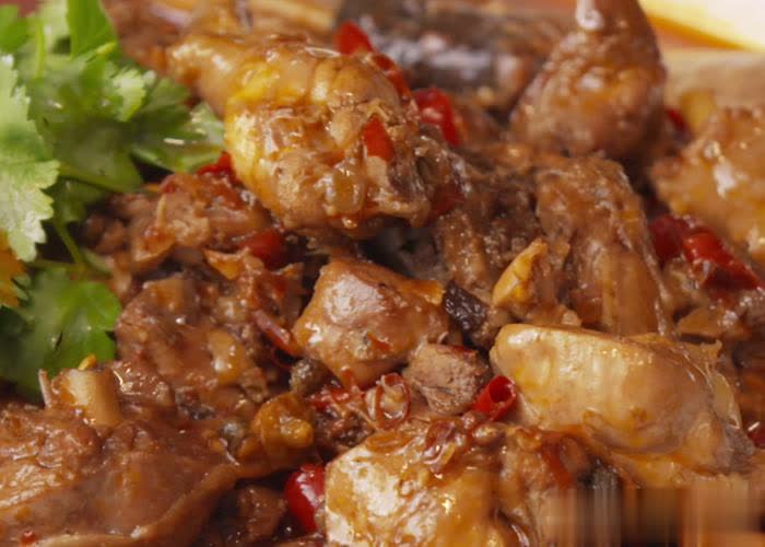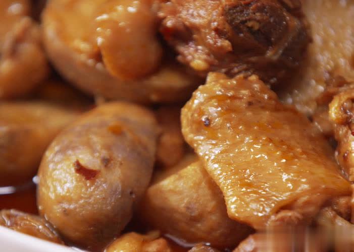 第四步:之后我们把油炸好的鸡块和准备好的茨菇倒入锅中,翻炒一分钟后加入没过鸡块的温水,适当搅拌煮沸之后,加入适量的蚝油,料酒,盐,鸡精,生抽,老抽,白糖翻拌30秒,然后盖上盖小火炖煮20分钟,最后大火收汁,适当翻拌炒30秒后即可出锅品尝。