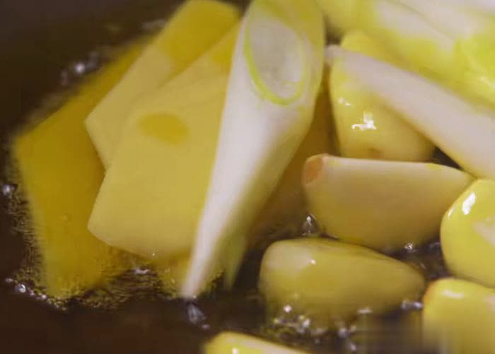 第二步:锅底留油,把准备好的葱段、蒜瓣、姜片一并倒入锅中爆香出香味。